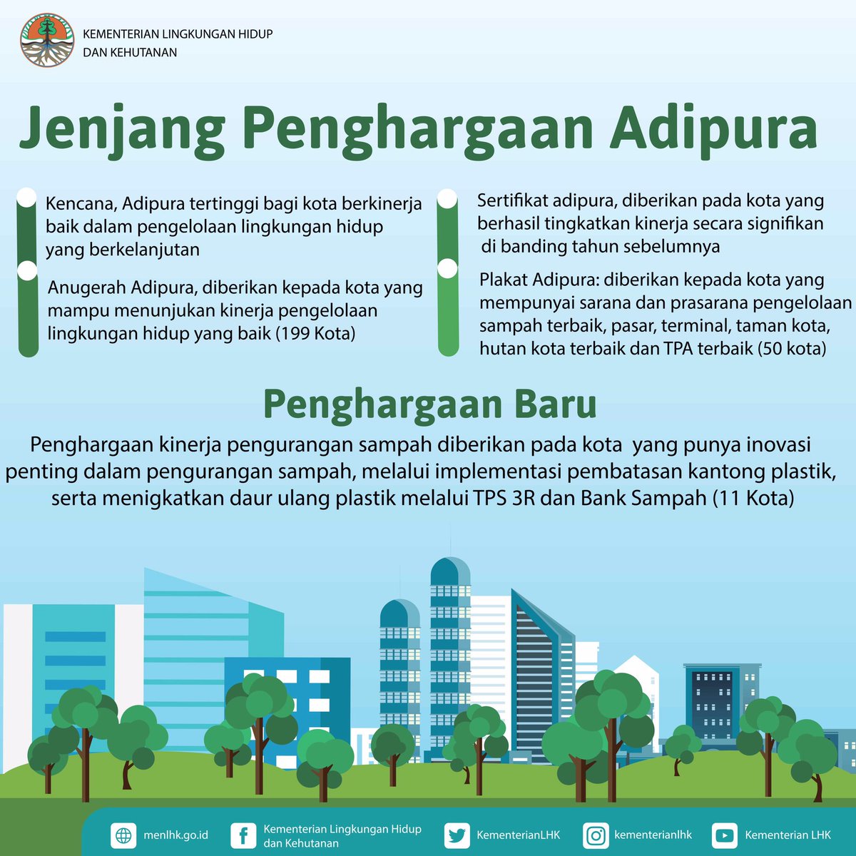 Penghargaan tertinggi bidang lingkungan hidup di indonesia terdiri atas kalpataru, adipura, dan adiwiyata. Adipura adalah gelar penghargaan yang diberikan kepada kota yang dinilai paling bersih dan rapi oleh pemerintah pusat. Salah satu kriteria penilaian dalam penghargaan adipura adalah implementasi atas amanat uu nomor 18 tahun 2008 tentang pengelolaan sampah, yaitu upaya dan hasil dalam memenuhi target nasional. Cv adipura mandiri adalah pabrik tas yang berdiri sejak.
