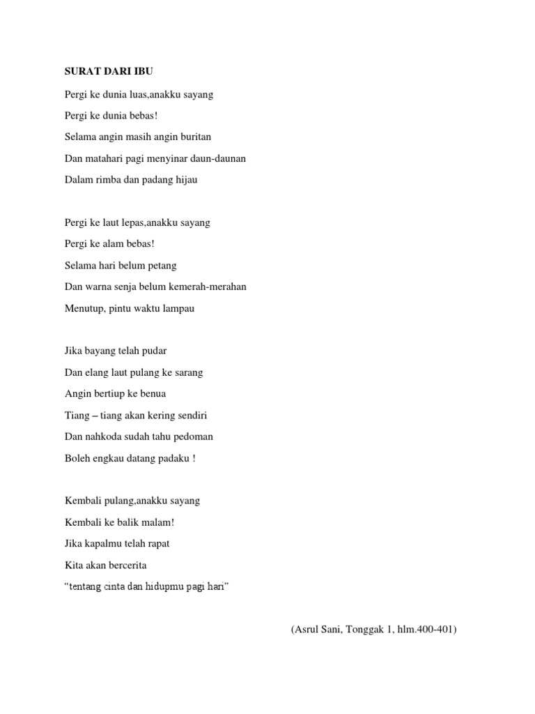 Dalam antologi tiga menguak takdir asrul sani tak kurang menyumbangkan delapan puisi, kecuali puisi berjudul surat dari ibu. Asrul sani adalah salah satu dari seniman pelopor di angkatan '45 yang lahir di rao, pasaman, sumatera barat pada tanggal 10 puisi surat dari ibu merupakan salah satu dari sekian banyak puisi modern dan kontemporer indonesia yang termasuk ke dalam kumpulan puisi. Savesave surat dari ibu.docx for later. Bibitnya sudah ditanamkan oleh ibu dan ayahnya sejak ia kecil.